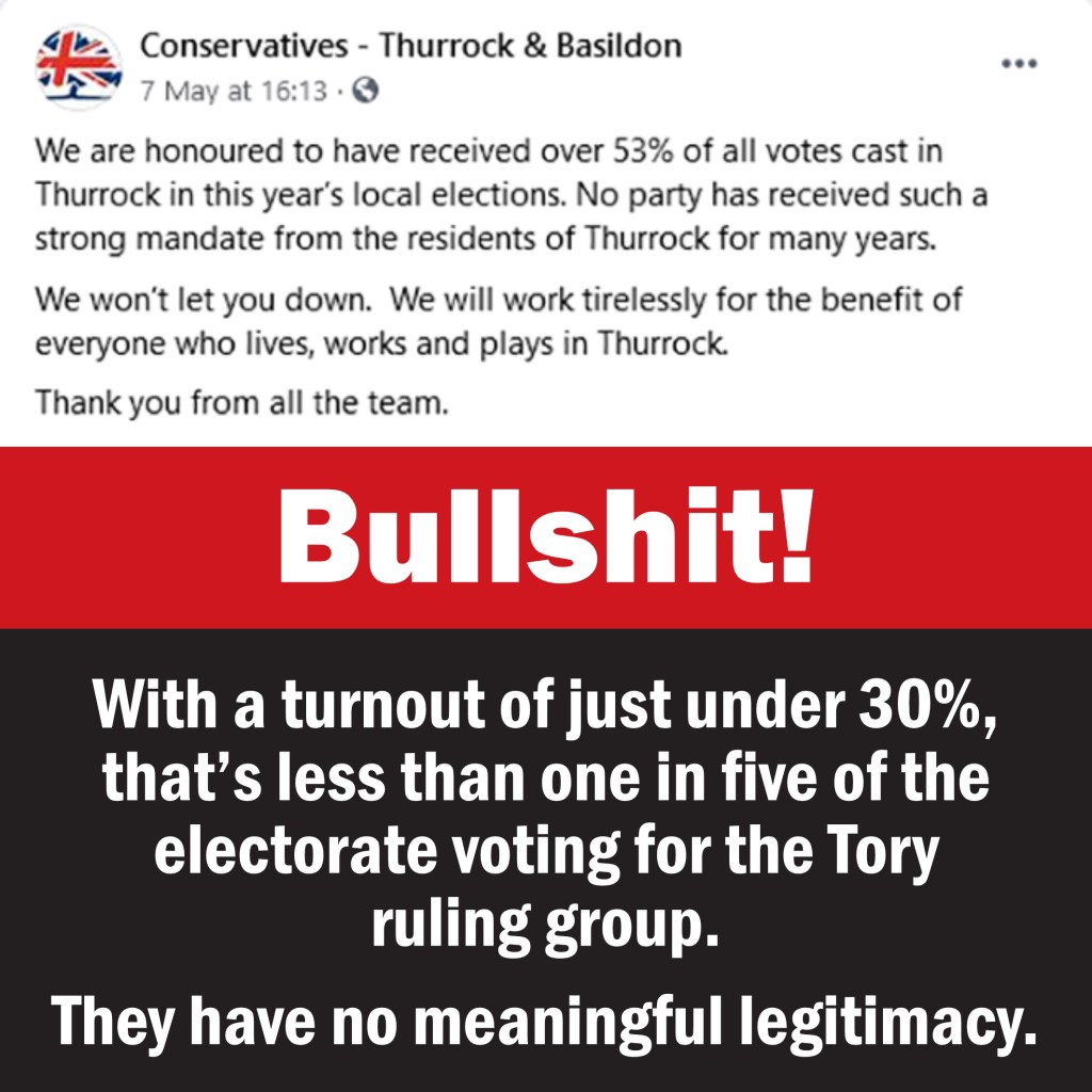 When we saw this post on the Conservatives – Thurrock & Basildon Facebook page, our jaws pretty much hit the ground at the level of bullshit and hubris on display. Do these puffed up, self important politicos ever take notice of what really happens? Or in the case of the turnout in the local elections on 6 May, what didn’t happen…