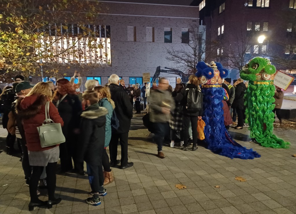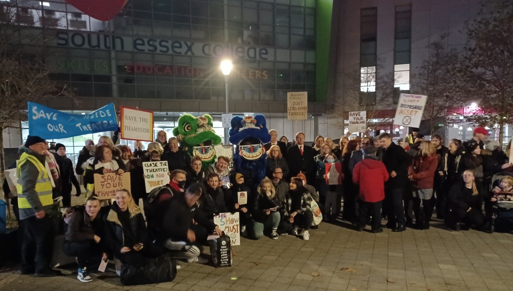 On the evening of Wednesday 24.11, we attended a peaceful protest in Grays against the threatened closure of the Thameside complex which as well as the theatre, also houses the library and museum. The protest took place before a full meeting of Thurrock Council where the future of the complex was to be discussed. Because of ongoing ‘difficulties’ at the Civic Offices, the meeting had to take place over the road at the Grays campus of South Essex College.